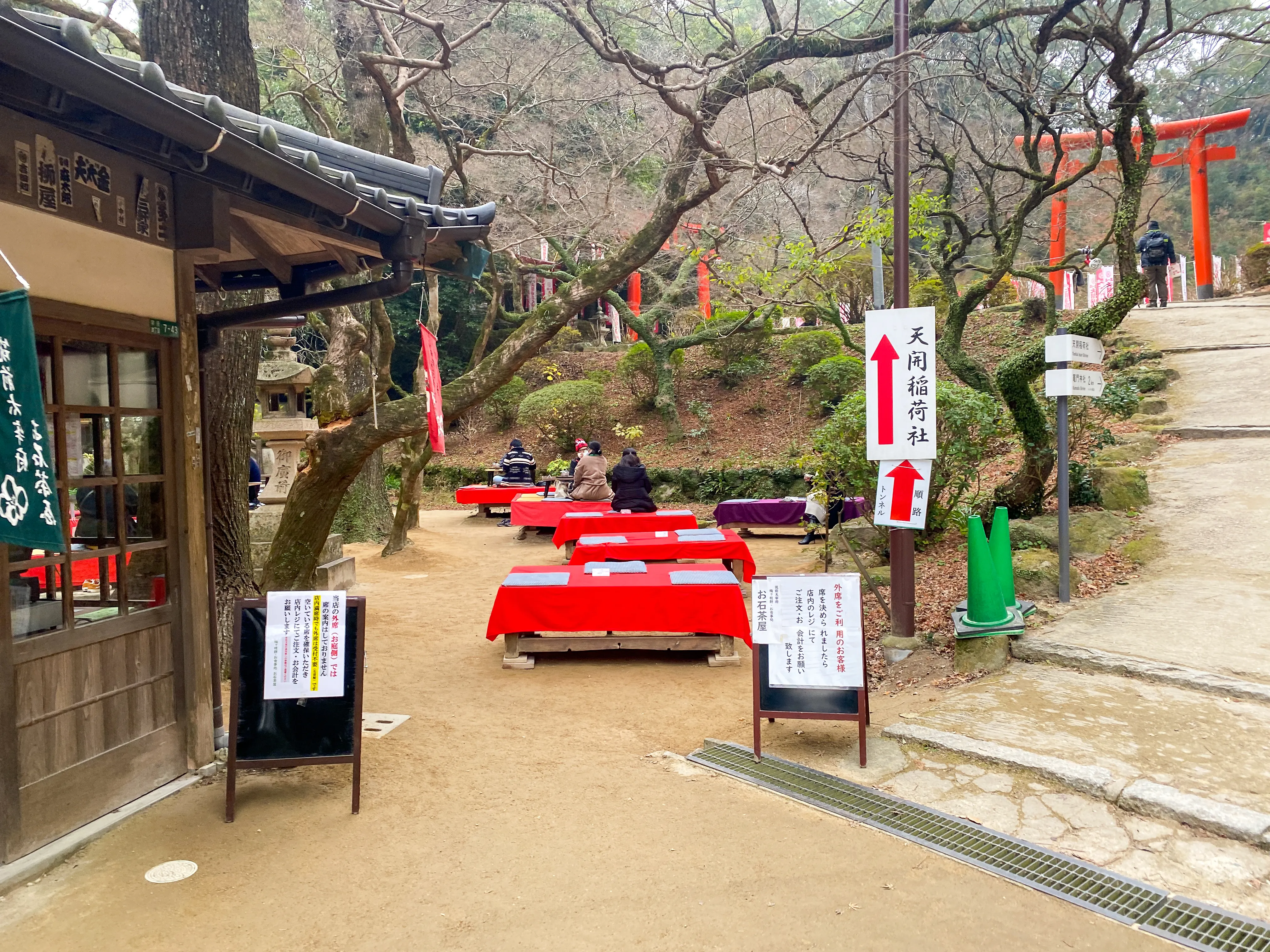 「天開稲荷社」向かう途中には甘味処があります。寒い日はぜんざいもありだと思いますが、せっかく大宰府に来たのなら梅が枝餅が一番ですね!