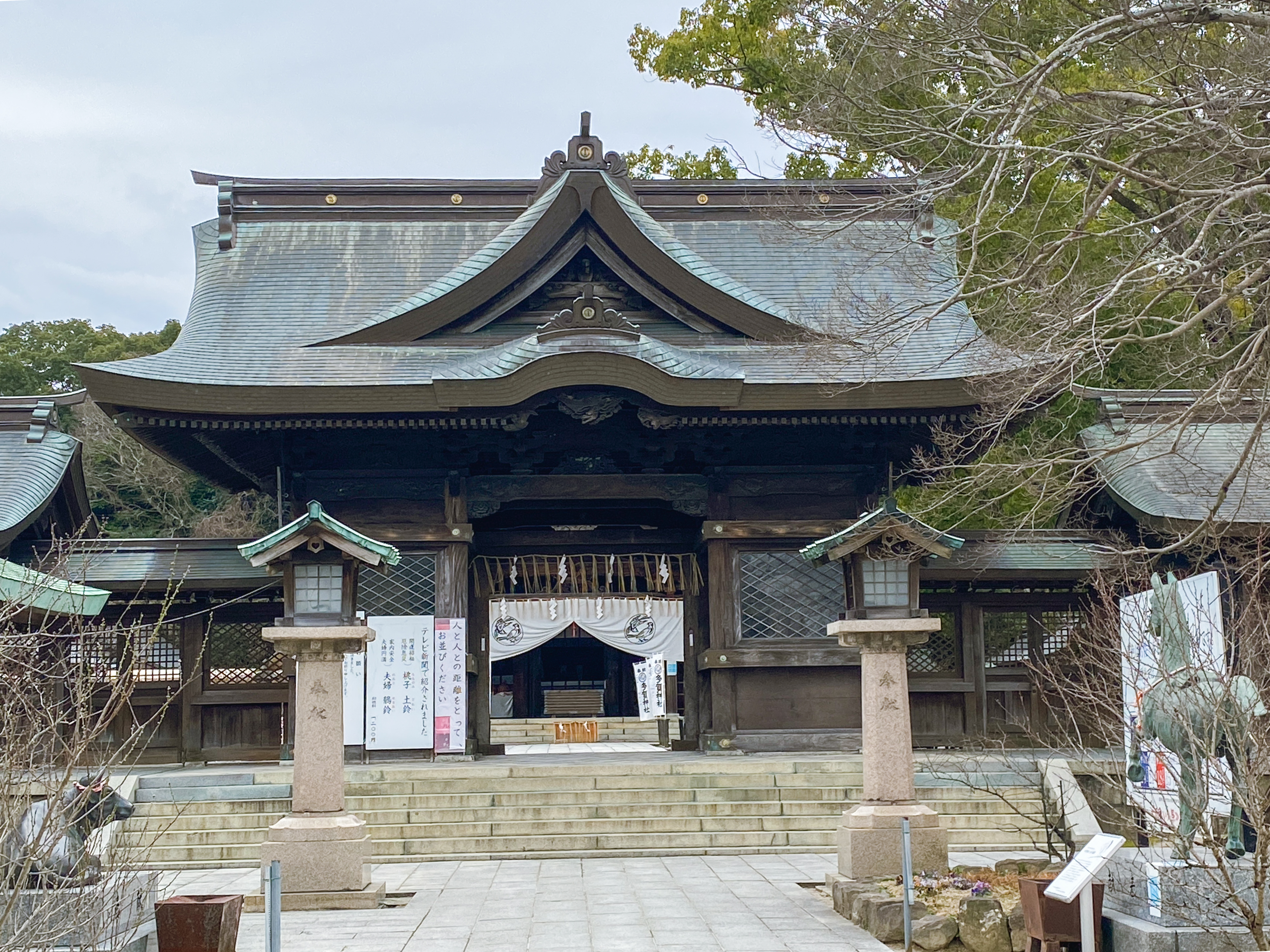 福岡県直方市にある「多賀神社」の楼門です。向かって右側に「神馬像」があり、左側に「撫牛」と御手水があります。