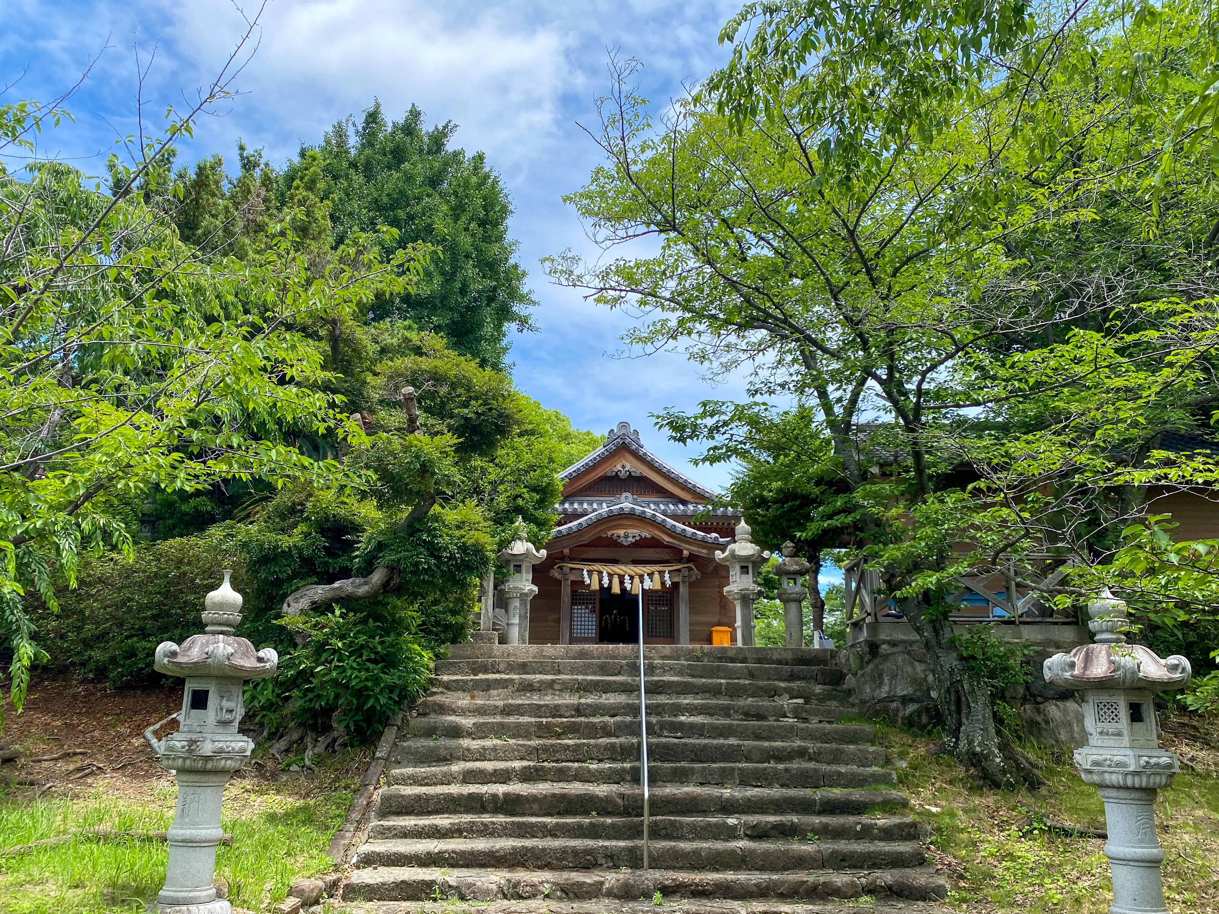 階段を上ると本殿が見てきました。階段は結構長いですし、すこし足場が悪かった印象でした。にしてもいい天気ですね。とても気持ちよく参拝できました。