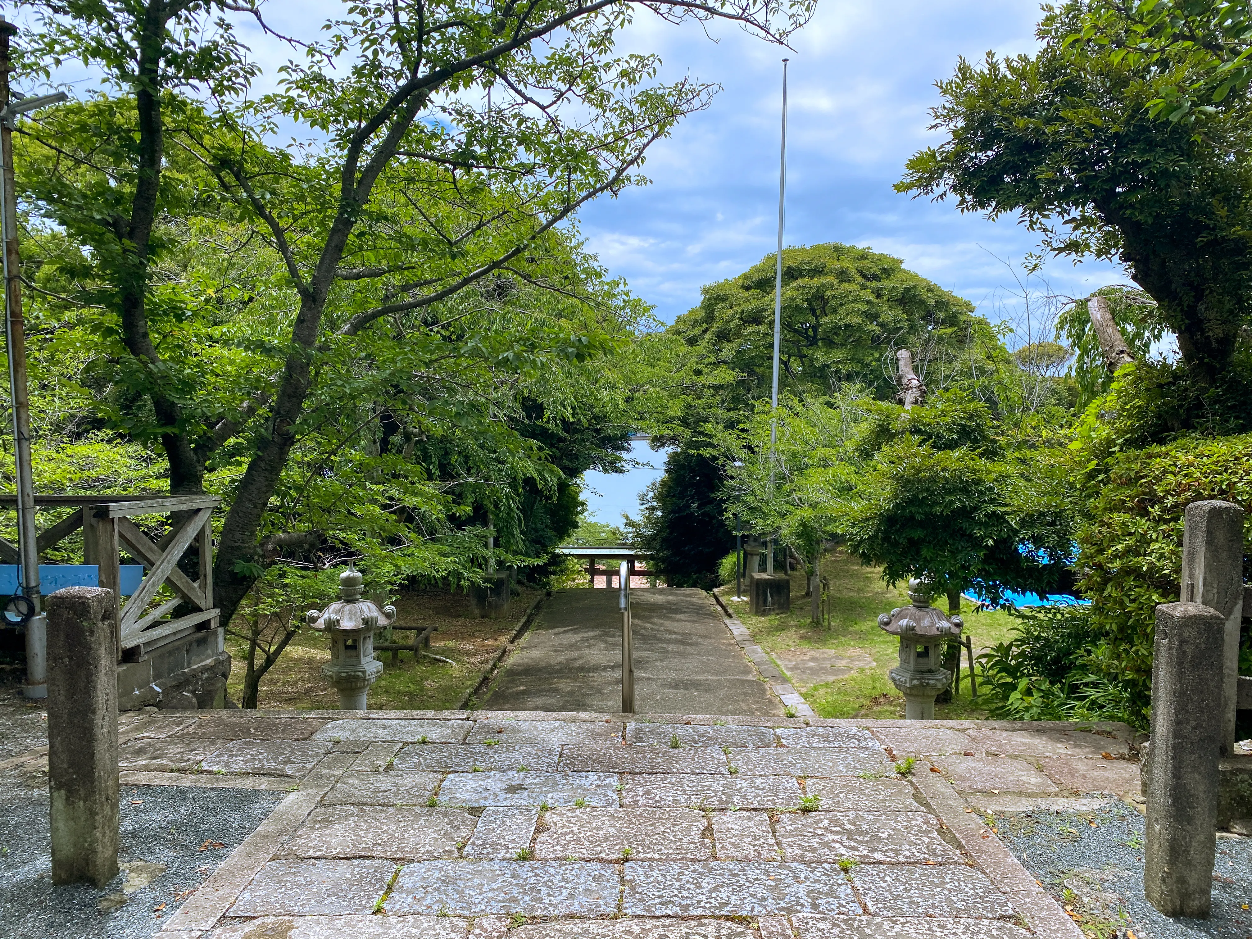 あまり上手に撮れなかったのですが、本殿前から入口の方を撮った写真です。青い空と青い海が広がっていて、とても神聖なところに来れたという気持ちになります。
