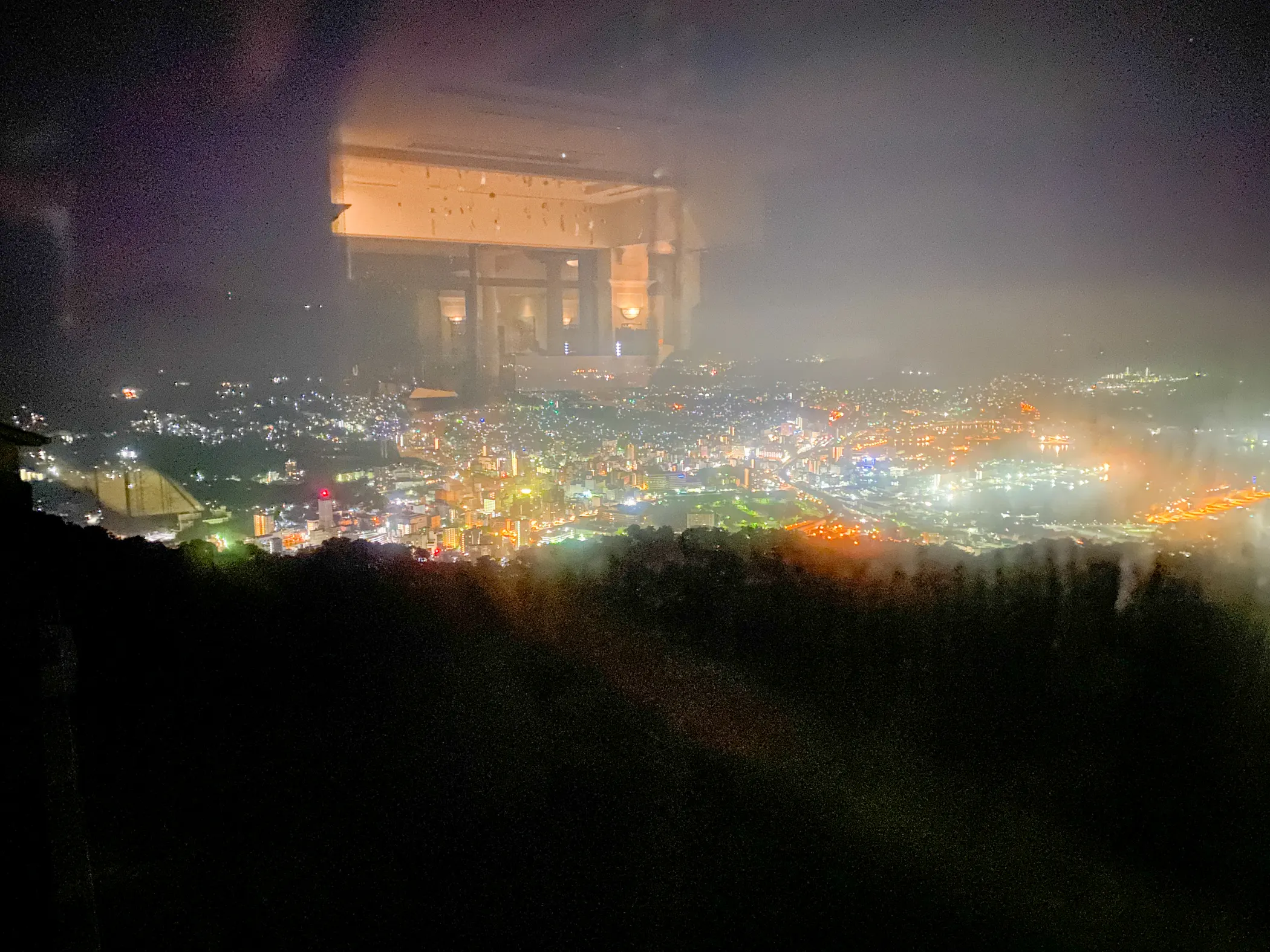 テラスから見える昼の景色と、夜景です。テラスはbarになっており(私が行った時は閉まっていましたが、、、)めちゃくちゃ気持ちのいいソファーでゆっくりすることができます。 この「弓張の丘ホテル」にはプールも付いています。さすがに水着の方を写真で撮るのは失礼だと思い撮ってはいません。水着の貸し出しはしていないので、プールで泳ぎたい場合は必ず水着を持参してくださいね。